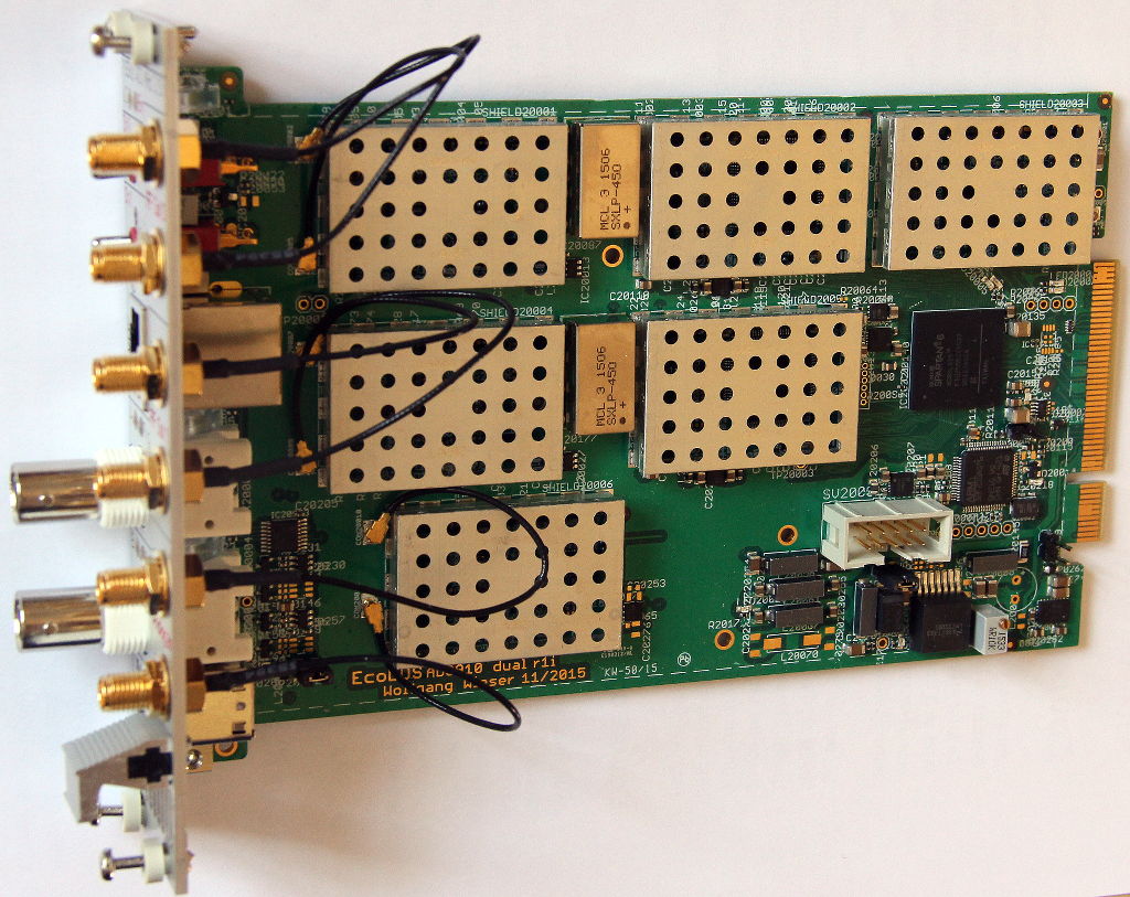 The FlexDDS-NG mainframe integrates a powerful dual-core 900 MHz ARM computer with 1 GByte of RAM running embedded Linux. More than 500 MBytes of instructions for the waveform generator slots can be stored inside the rack acting like a vast FIFO storage. For more demaning applications or to free up the load from lab control computers, you can run your own programs on the FlexDDS-NG's integrated computer. In contrast to the legacy FlexDDS, the FlexDDS-NG features a high speed GBit Ethernet interface (instead of USB) which eliminates all operating system driver issues. It also allows to control the FlexDDS-NG from any computer — and even to control multiple channels from different computers.
